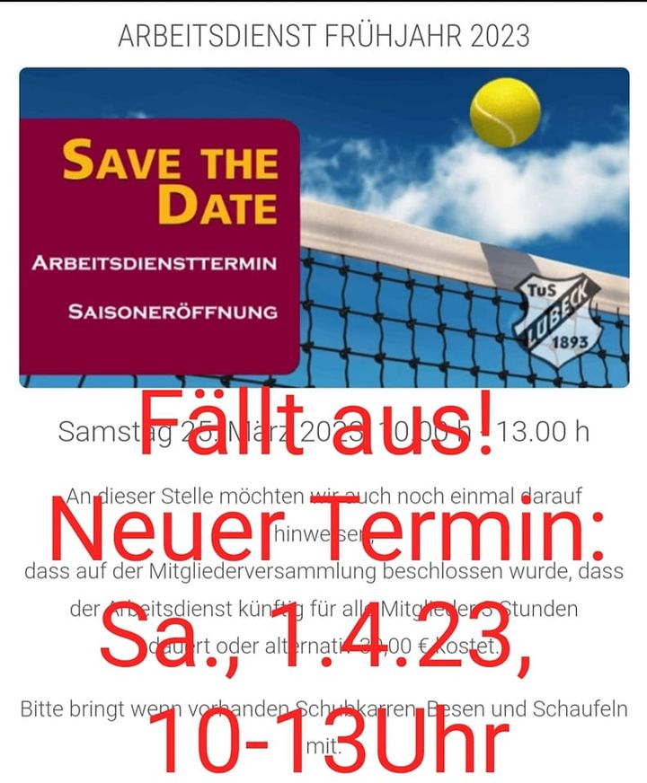 Der für heute angesetzte Arbeitsdienst fällt leider aufgrund der Witterung aus. Bitte seid nächsten Samstag dabei, wenn wir die Anlage startklar für die Saison machen wollen.