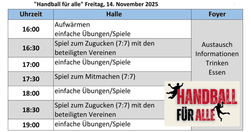 Am Freitag, 14. November 2025 von 16 Uhr bis 19.30 Uhr laden die Hansestadt Lübeck und der Turn- und Sportbund sowie drei Lübecker Handballvereine zum inklusiven Aktionstag „Handball für alle“ in die Meesenhalle in der Kantstraße 12 am Kaufhof ein. Neben vielen Übungen zum Mitmachen wird um 17.30 Uhr ein Handballspiel angepfiffen, bei dem alle, die Lust haben, mitspielen können. Dabei steht die Freude an der Bewegung und das Miteinander im Vordergrund. Und wer (noch) nicht zum Handball greifen möchte, darf gerne zugucken und die Spieler:innen anfeuern – auch um 16.30 Uhr und 18.30 Uhr, wenn die beteiligten Vereine zum Handballspiel auflaufen. Außerdem wird es Informationen und Möglichkeiten zum Austausch bei Kaffee und Kuchen geben.
