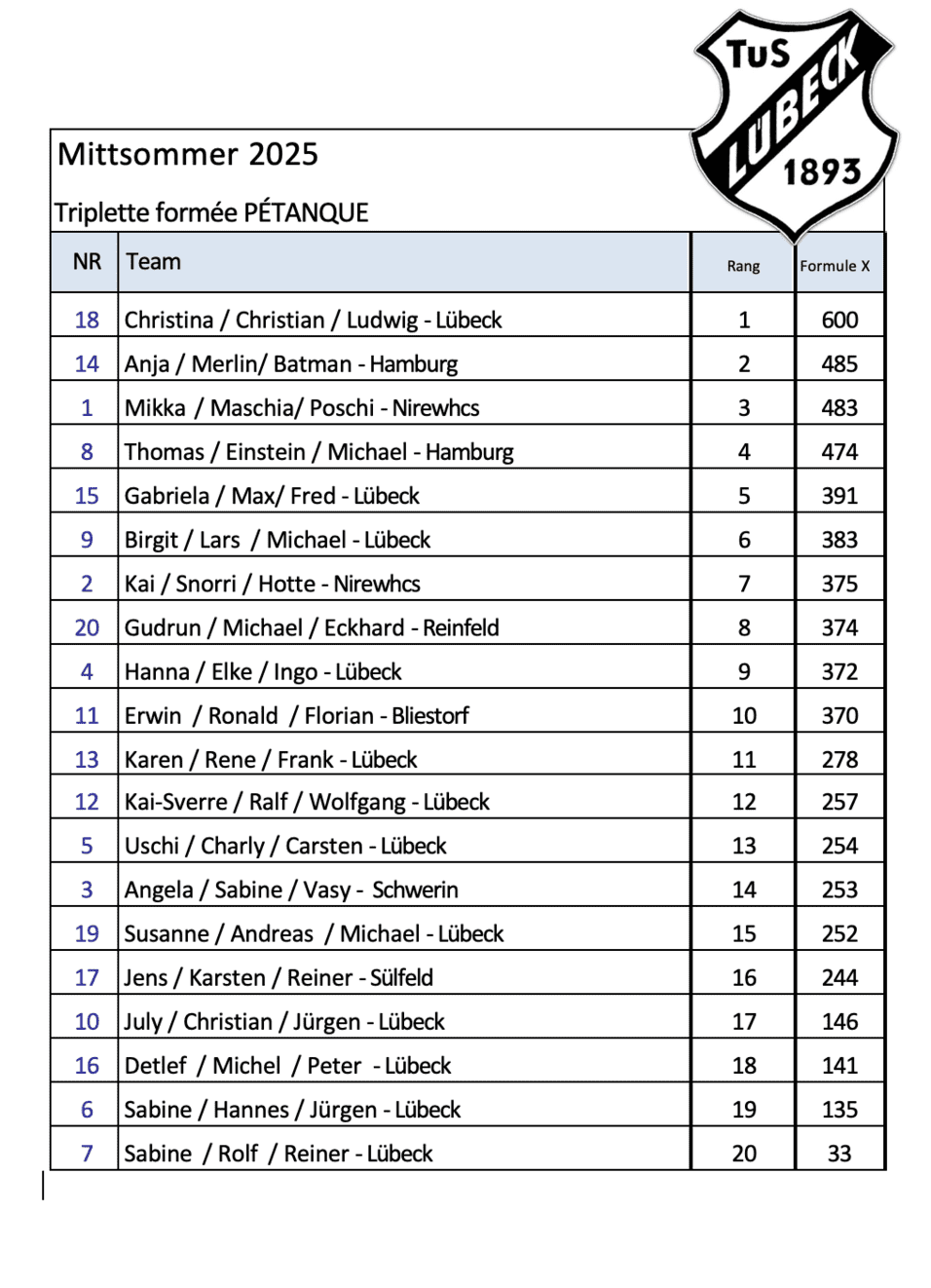 Zum Empfang der 60 Aktiven war das Boulodrome mit bunten Wimpeln und frischem Grün geschmückt. Höchst willkommen die Getränke im Bauwagen und in der Mittagspause die Original-Hotdogs wie beim „schwedischen Elch“. Fleißige Helferinnen haben die Gäste bewirtet. Ganz besonders geschätzt wurden in Spielpausen die Schattenplätze in den aufgestellten Zelten. Die Stimmung war entspannt und sportlich ambitioniert. Auf dem Siegerpodium landeten auf den ersten Plätzen Gäste-Teams. Die TuSler wissen eben, wozu Gastfreundschaft verpflichtet. Das Niveau der Spiele und die Fairness waren so hervorragend, dass auch bei den unterlegenen Teams die gute Stimmung nicht gelitten hat. Die vielen freundlichen Fotos belegen es ganz klar. Ganz offensichtlich herrschte allgemein eine große Zufriedenheit, was ein Team so ausdrückte: „Können wir uns für 2026 bereits wieder anmelden!“ Offensichtlich hat sich die Mühe gelohnt. Was will man als Veranstalter mehr …