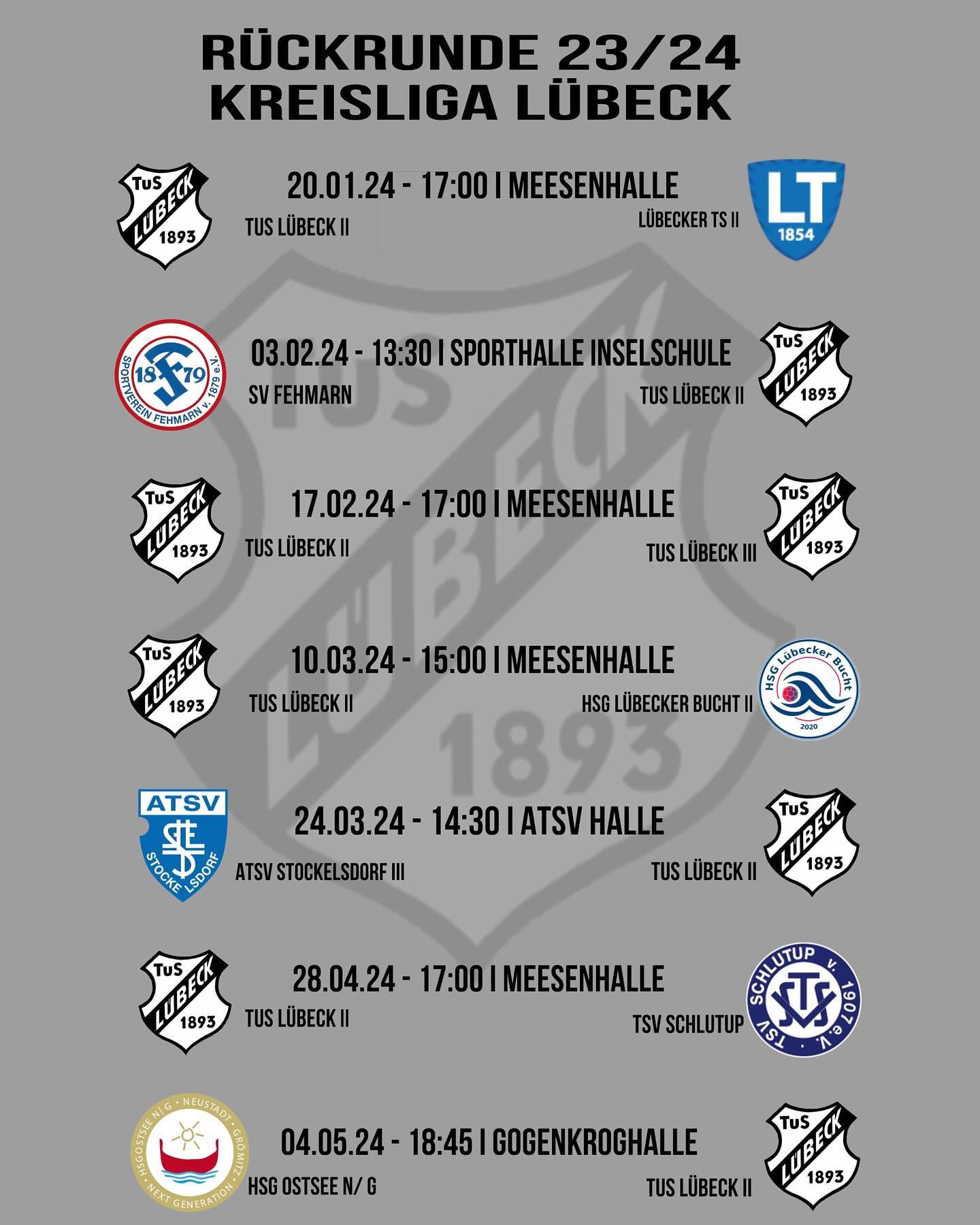 Endlich steht der Spielplan für die Rückrunde fest. Wir starten in der Kreisliga mit einem Heimspiel am 20.01. um 17:00 gegen die Mädels vom @luebeckerts2.damen 🚀